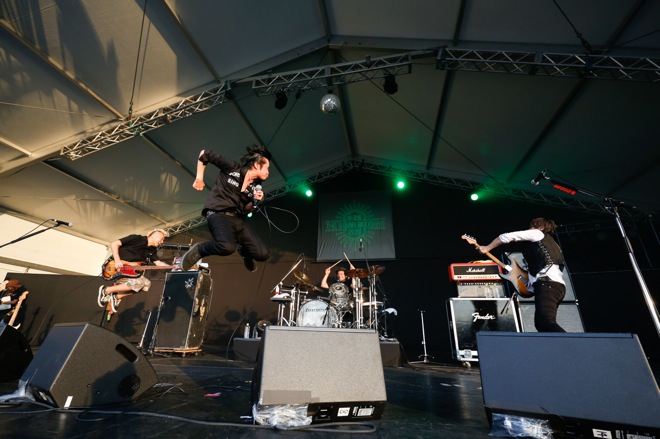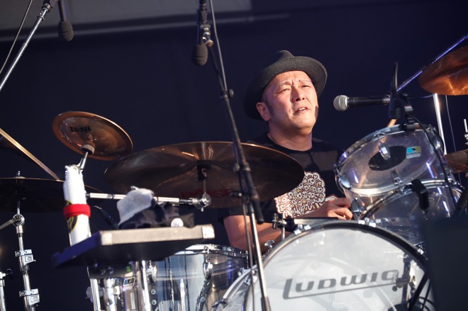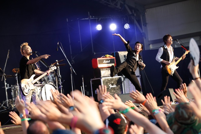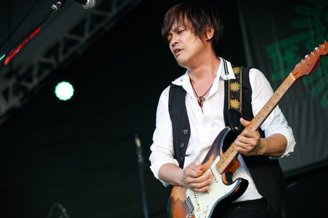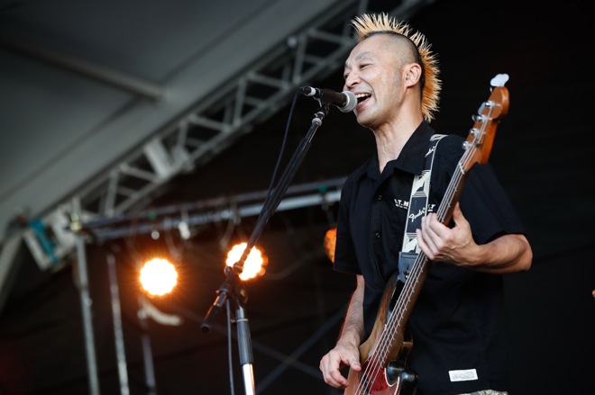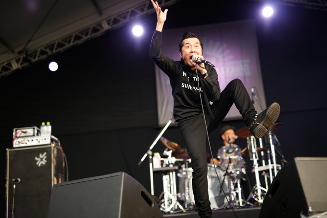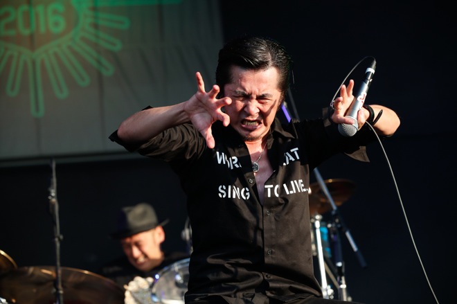 そして、ラストの「サスパズレ」でライヴ・バンドとしての怒髪天の底力が炸裂した。増子のトークと演奏パートからなる組曲とも言えるこの曲をたっぷり10分かけて披露。とあるツイッター投稿で“怒髪天なんて楽器を持った土方だ”と書かれた憤りを、“いいんだよ。元々、土方なんだもん。土方の方に失礼だ”と言いながら訴えたり、その昔、吉田拓郎が「人間なんて」1曲を2時間演奏したエピソードに励まされ、この「サスパズレ」を演奏していると不敵に笑ったり、次にREVOLUTION STAGEで演奏するDragon Ashに因んでKj絡みの笑い話を披露。この粘っこさが、“(彼らを見ていると)ベタベタなロックをやっている自分が気恥ずかしくなる”と増子が言う若い才能あるロック・バンドに出せるだろうか。いや、出せまい。ロックを32年やってきたキャリアは決して伊達ではない。終わりそうで終わらないこの曲は、巻きが入らなければ、まだまだ続いたはず。この曲を長々とやるため、どうやら曲を削ったっぽい。