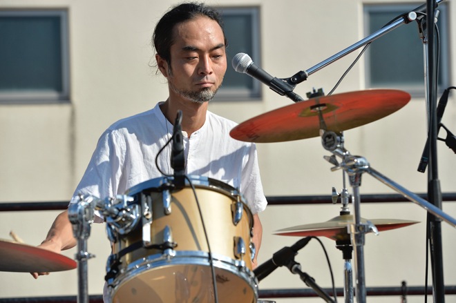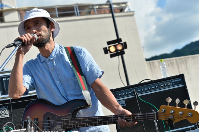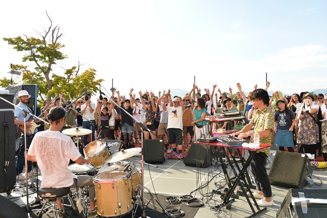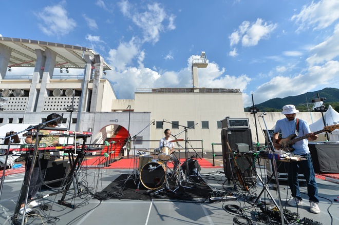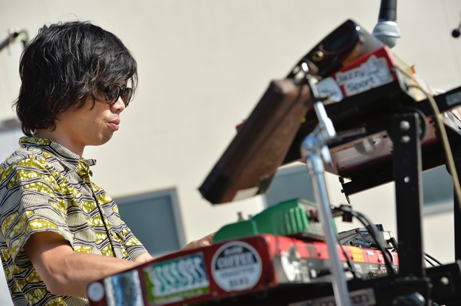 金子巧が奏でる静かなピアノの旋律からライヴが始まると、その音に導かれるようにステージに続々と人が集まってきたと同時に、蝶々や虫も舞い込んでくるのが野外フェスらしい。「ゆっくりやるんで、酒でも飲んでゆっくり楽しんでください」とコスガツヨシ。ジャムバンドらしく、曲は途切れなく続いているものの少しずつ変化して行く。トライバルなリズムに乗って緩やかなラウンジミュージック風な演奏を聴かせていたかと思うと、徐々にBPMを上げていき、スペイシーなシンセの音が加わると、とたんに世界が変わった。
