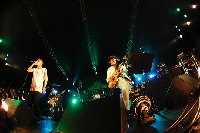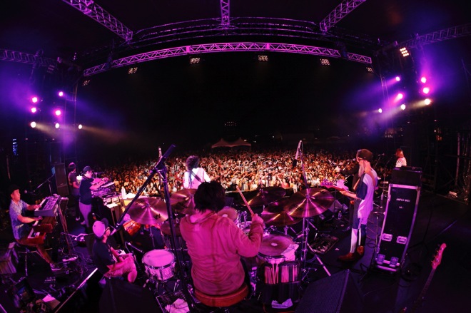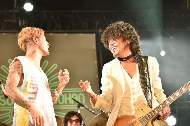 そこからコーラスとして、RESPECT STAGEで見事なパフォーマンスを披露した真城めぐみ(ましまろ)が参加して「ドレッドライダー」へ。洗練されていながらも、そこにある生々しさは消えず、どこまでも浮世離れしないサウンドを展開だ。真城の声もいい色合いをつけていき、曲終わりにはタイジの誘いから会場中がピースサインで埋め尽くされ、誰しも自然と笑みがこぼれてしまう。