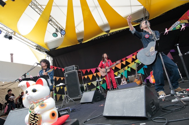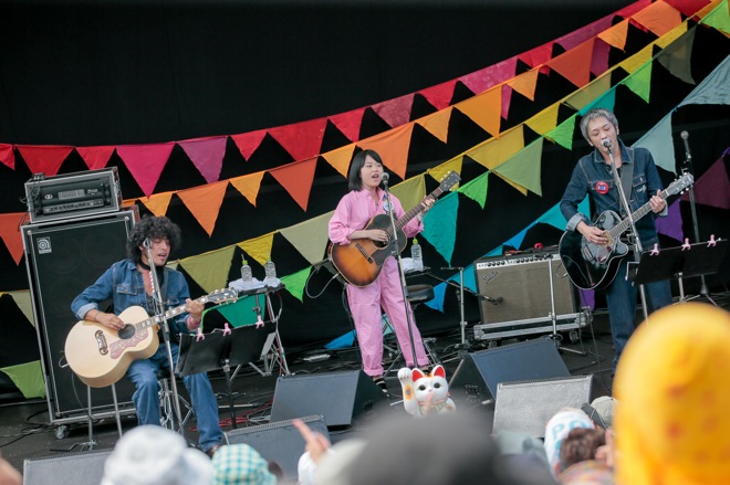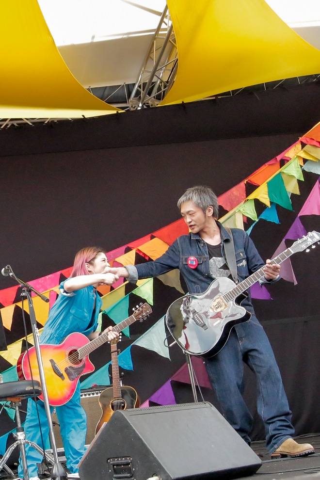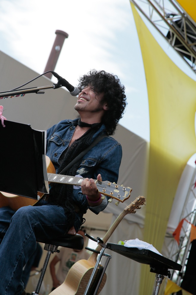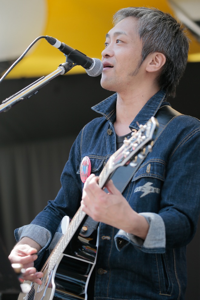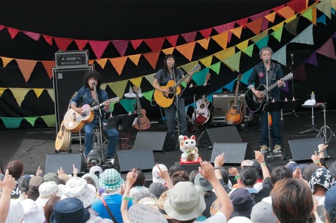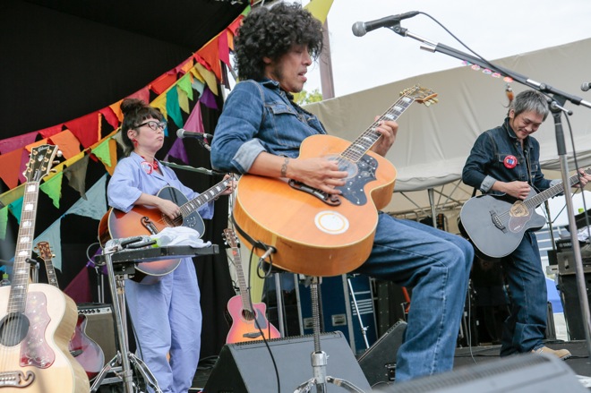 まずは専務取締役の佐藤タイジと常務取締役の高野哲がフラリと登場、アコギを手に“清志郎があきれてる ジョン・レノンもあきれてる”と歌う「BIG-HIT」からスタートした。この日は雨も心配されていたが、“ソーラーマン”ことタイジのおかげで太陽の下に多くの「社員」が集結している。そう、インディーズ電力のライヴではお客さんが社員なのだ。また、ステージ向かって左手にタイジ、右手に高野が陣取り、センターには“1日社長”として次々とゲストが登場するステージ進行は豪華極まりない。