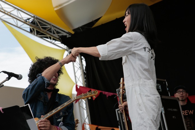 キュートなピンク色のツナギ姿とは裏腹に、ブルースフレーズとファンクネスを持ったギタープレイで唸らせたRei。続いて青色のツナギで登場したORESKABANDのiCasは社長として、曲順を間違えたタイジを上から目線で注意して笑わせ、「Walk」で伸びやかな歌声を聴かせるなど堂々たるステージングでそれぞれが個性ある社長ぶりを見せてくれた。