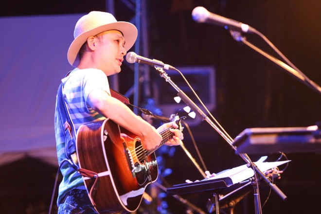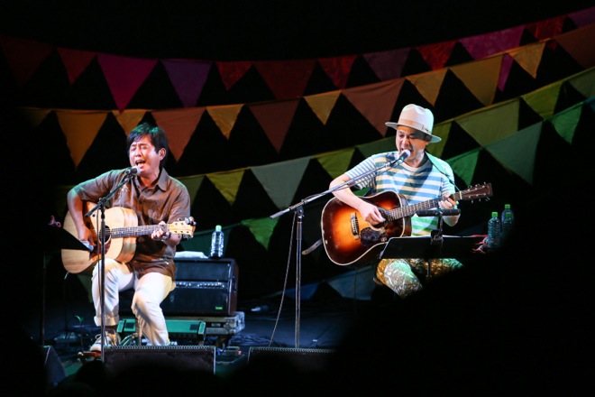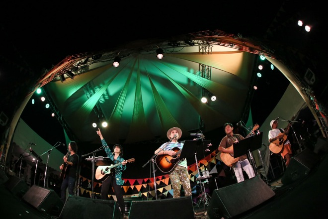 浜崎が出演メンバーを呼び込むと、山田将司(THE BACK HORN)、PES(RIP SLYME)、佐藤竹善(Sing Like Talking)、仲井戸“CHABO”麗市が次々とステージへ。全員がアコギを弾きつつ「調子はどうだい?」とお互いの名前を出して声を掛けあう「GACHIのテーマ」で幕を開けた。続く「デイ・ドリーム・ビリーバー」の歌詞を分け合うと、オーディエンスもサビに合わせて一緒に口ずさんでいる。近年はイベント等で歌われる機会も多いこの曲は、昼間のインディーズ電力に続いての選曲であり、この曲をCHABOが歌うのは貴重だ。