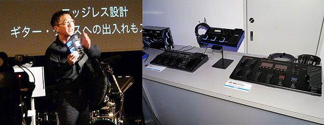 ▲金属部のエッジに丸みを持たせたことで、ギターやケースに傷をつけることなく、スムーズにバッグに入れられるというデモも実演(左)。一緒に展示されたME-80とGT-100と比べるとそのコンパクトさがよくわかる(右)。