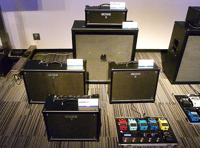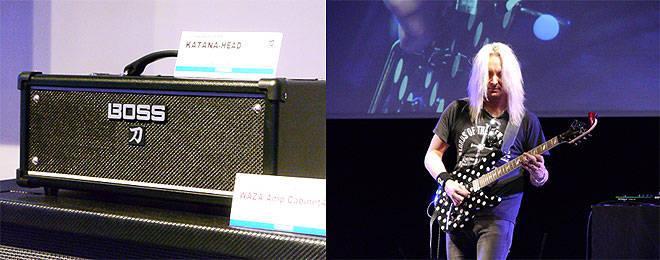 ▲WAZA AMPに続き、漢字を使ったアートワークのKATANAアンプ(左、写真はKATANA-HEAD)。BOSS製品のデモはROBERT MARCELLO(右)。ハードなロックサウンドからメロウなトーンまで、多彩なギターサウンドを聞かせてくれた。