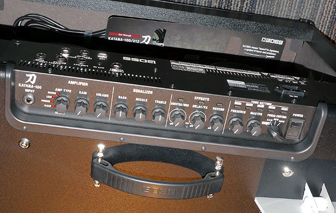▲トップ・パネルにはアンプタイプ、GAIN、VOLUME、3バンドのイコライザー、エフェクト(BOOSTER/MOD、DELAY/FX、REVERB)、PRESENCE、MASTERボリュームを用意(KATANA-50はPRESENCE非搭載)。写真はKATANA-100/212。