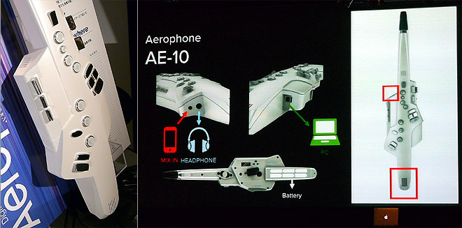 ▲インターフェイスはサックスに準拠。本体にはINPUT端子、PHONES/OUTPUT端子、USB COMPUTER端子を用意。内蔵スピーカーは写真右の赤で囲んだ2カ所にある。
