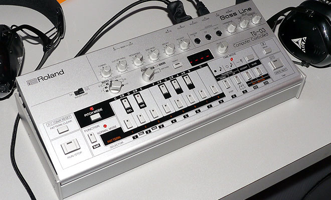 ベース・ライン「TB-03」は、アシッドハウス登場以降、独特のシーケンスによるフレーズと太いシンセ・ベース・サウンドで人気を博した「TB-303」を再現したモデル。当時の機能やノブはもちろん特徴的な音色変化も再現。新たにステップ・レコーディング・モードによる音作りや、OVERDRIVEやDELAYなどの専用エフェクターを搭載。当時未対応だったMIDI、アナログ・トリガー入力にも対応、外部機器との連携を強化した。