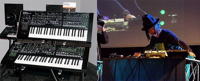 ▲2段積みで展示、迫力抜群のSYSTEM-8のデモ機(左)。今回の新モデル開発時に多くのアドバイスをしたという齋藤久師がアシッドなサウンドを即興演奏(右)。