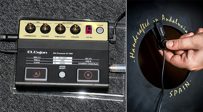 ドラム、パーカッション関連製品ではまず「エルカホン」シリーズ第2弾となるカホン専用マイク・プロセッサー「EC-10M」(9月17日発売)が登場。アコースティック・カホンの音をマイクで拾って増幅し、それに内蔵音色を重ねて演奏することができるプロセッサーだ。