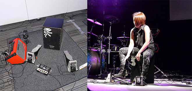 ▲2本のトリガー・ペダルを追加したセッティング例(左)。同様のセッティングでカホン+EC-10Mによるアグレッシブなパフォーマンスを披露したのは桝谷マリ(右)。