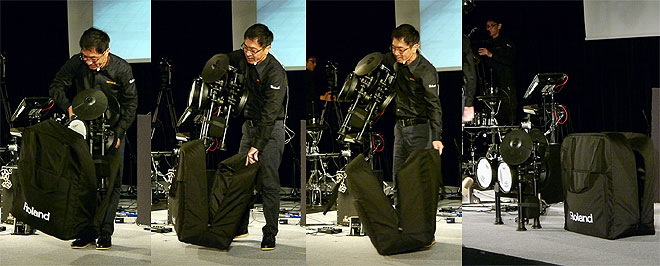 ▲ステージ上でキャリングケースからTD-1KPX-Sを取り出すデモを実演。驚くほどカンタンに取り出し&セッティングができる