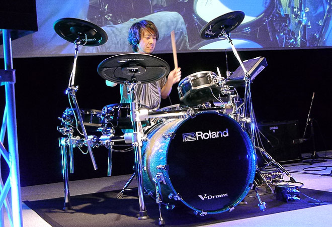 ▲フラッグシップ・モデルTD-50KVで迫力あるリアルなドラムサウンド、V-Drumsならではのエフェクティブなサウンドを演奏した熊谷徳明。