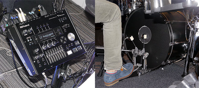 ▲Vドラム音源のフラッグシップ・モデルTD-50(左)はドラムを構成するさまざまなパーツや、それらから発生するレゾナンスなどの要素を仮想的に合成してドラム・サウンドを一から再構築、ドラムの生々しい響きや自然な減衰、空気感をち密に表現する。写真右はアコースティック・バス・ドラムのシェルに取り付けられたキック・ドラム・コンバーター「KD-A22」。