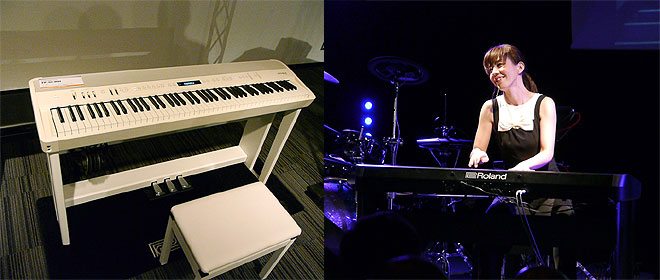 ▲ポータブルモデルの「FP-90」はホワイトとブラックをラインナップ。デモ演奏は広田圭美。
