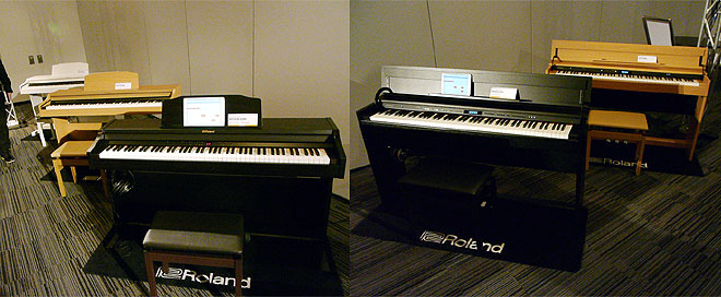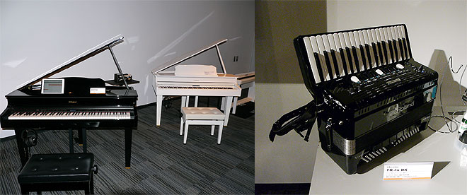 ▲デジタル・グランドピアノ「GP607」(左)とVアコーディオンのピアノ鍵盤タイプ「FR-4x」(右)
