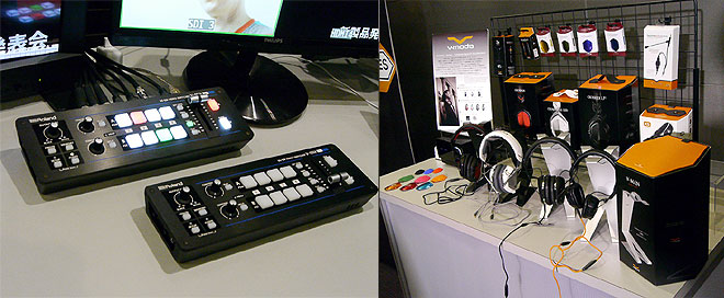 ▲映像関連の新製品として、省スペース設計のプロ仕様ビデオ・スイッチャー「V-1SDI」もラインナップ(左)。会場のロビーにはローランド傘下となったV-MODAのヘッドホンも展示(右)。