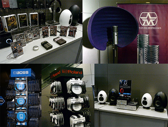 ▲8月に発表となった、海外輸入ブランド製品(AUDIOFLYのイヤホン、Aston Microphonesのマイク、MunroSponicのモニター)、Roland/BOSSのアクセサリーなども展示。