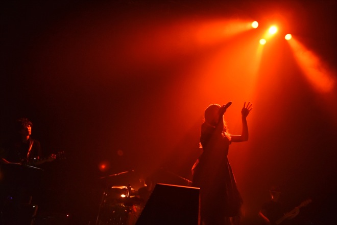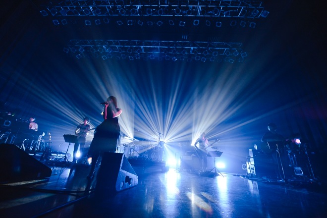 まずは黒いドレスを着たAimerが姿を現し、一曲目の「StarRingChild」がスタート。5人のサポートメンバーが重厚なバンドサウンドを奏でる中、ステージ中央に位置したAimerは自らの世界に入り込むように、一歩たりとも動くことなく、力強い歌を響かせる。やはり、彼女は歌い始めた途端に一瞬にして場の空気を変えてしまう声の持ち主だ。「Brave Shine」ではザクザクと刻むギターと歩調を合わせるかのように、その歌はさらにダイナミズムを増していく。