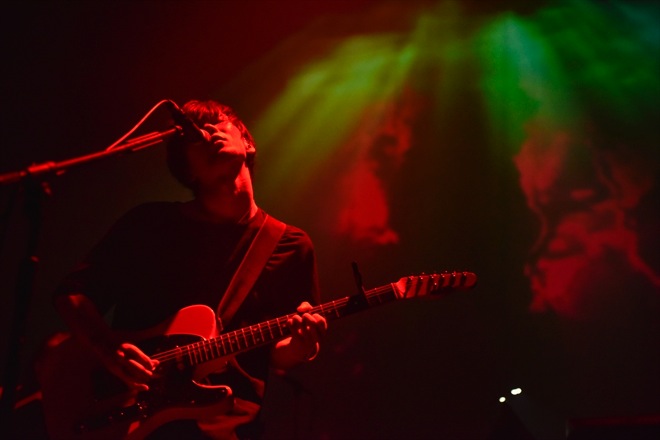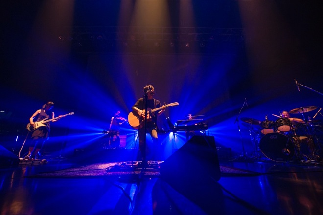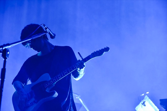 ここからはエレキをアコギに持ち替えて、初期曲の「haze」、さらに「flower」と続き、佐藤のヴァイオリンが楽曲のドラマ性をより引き立てる。「flower」の途中で再びエレキを手にすると、今度は凛として時雨のセルフカバー「shandy」へ。ミニマルなピアノフレーズの反復を軸に性急な展開を繰り返す、このメンバーならではのアレンジを聴かせると、「新曲をもう一曲」と言って披露されたのが、9月発売のニューアルバム『white noise』に収録されている「Wonder Palette」。柔らかな音色のシンセとノイズギターの組み合わせは、白く輝く照明の効果も手伝い、外へと大きく開かれた印象を与え、間違いなくこの日のクライマックス。ラストは「unravel」で再び狂騒の渦を巻き起こし、本編が終了した。