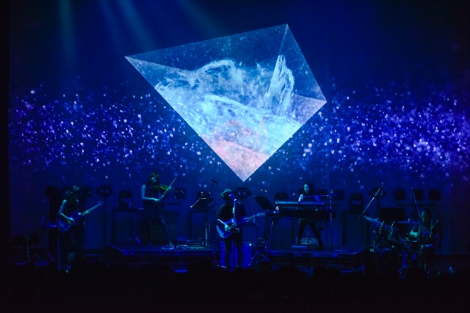 ベースのTOKIE、ドラムのBOBO、ヴァイオリンの佐藤帆乃佳、キーボードの大古晴菜というお馴染みのメンバーに続いて登場したTKのステージは、「Secret Sensation」でスタート。エレクトロニクスとエネルギッシュなバンド演奏、バックに映し出された映像が組み合わさり、一気に異次元のような空間が生まれる。さらには、テクニカルなギターフレーズのイントロから、TOKIEのスラップベースがリードするグルーヴィーな「kalei de scope」、コマ送りのように見える照明の演出も印象的な「Dramatic Slow Motion」と、序盤からアッパーな楽曲を立て続けに披露していく。