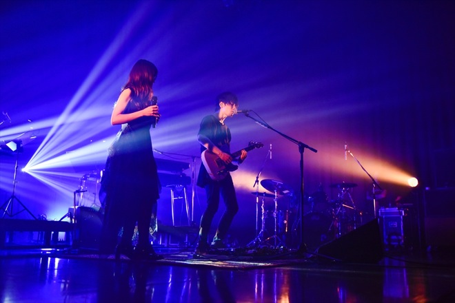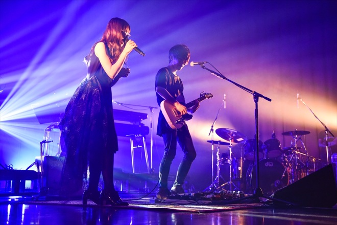 途中のMCは楽曲提供の経緯について。もともと凛として時雨やTKの作る音楽のファンだったAimerの依頼をTKが快諾し、2人でTKのスタジオに入って曲作りを行なって、2曲が完成したという。「コントラストのある2曲です」と言って、まず披露されたのがライブで歌うのはこの日が初だった「声色」。優美なストリングスが印象的なゆったりとした曲調だが、後半ではノイジーなギターがかき鳴らされる。さらに「TKのハイトーンに挑戦した」という「us」をエモーショナルに熱唱すると、オーディエンスからは長い拍手が送られた。