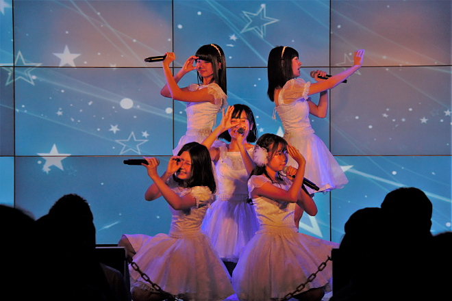 2016年4月11日からAKIBAカルチャーズ劇場にて始まったつりビットの定期公演。毎回決まったテーマに基づいたセットリストやカバー曲が楽しめるのはこの公演の大きな魅力。今日のテーマは何だろうとワクワクしながら開演を待っていると、「ウロコ雲とオリオン座」で着ていた純白の衣装をまとった5人が舞台に登場。秋の訪れを感じさせるナンバーで始まるのかと思いきや、ライブは人気の高いサマーチューン「裸足のマーメイド」で爽快に幕開け。つりビットらしいピュアスマイルをたっぷりファンに投げかけた後、マイナー調の「サバイバルドリーム」が始まると表情は途端にクールに。曲調に合わせてつりビットの大人びた雰囲気をステージから醸し出していく。