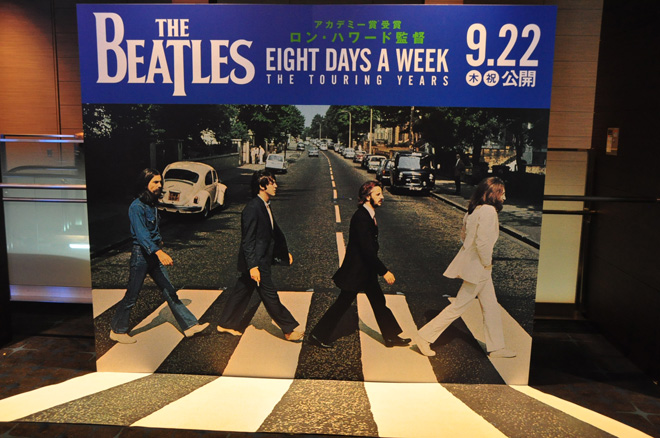 『ザ・ビートルズ~EIGHT DAYS A WEEK-The Touring Years』は、1970年の『レット・イット・ビー』以来46年ぶりのアップル公式作品でアカデミー賞受賞監督のロン・ハワードがメガホンを握ったドキュメンタリー作品で、1963年~66年のツアーを中心にザ・ビートルズの姿を描いたもの。プレミアイベント会場にはレッドカーペットならぬ、本作のキービジュアルのブルーに合わせてブルーカーペットが敷かれ、カーペットの途中には、「アビイ・ロード」の交差点のデザインが施されるという粋なもの。日本でも、劇場には「アビイ・ロード」の巨大な看板が設置されており、写真を撮るファンの姿が多く見られた。