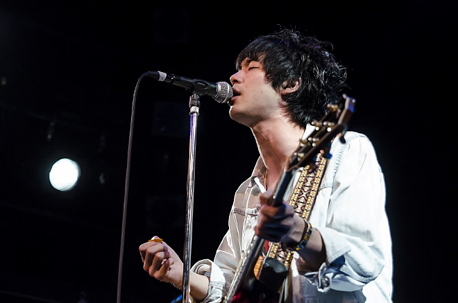 後攻はイベント主催バンド・黒猫チェルシー。暗闇の中、楽器隊によるグルーヴィーなセッションがスタートしたかと思うと、渡辺大知(Vo)が登場しライブスタート。1曲目の「嘘とドイツ兵」から澤竜次の強烈なギターソロが唸り、開始早々アップテンポな2曲を立て続けに披露。会場のボルテージは一気に上がった。