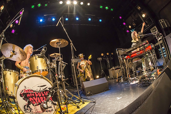 記念すべき1回目の対バンアーティストに選ばれ、先攻で登場したのはモーモールルギャバン。眩しいばかりの金髪に美脚を存分に見せつけたボクサーパンツ一丁のゲイリー・ビッチェ(Dr/Vo)と、キーボードから銅鑼まで使いこなすテクニシャンな紅一点ココ=カティ。心地の良い安定の重低音でバンドをまとめるベーシスト、T-マルガリータからなるインパクト抜群の3ピースバンド。インパクトも勿論のこと、その高い演奏技術とパフォーマンスで大いに会場を盛り上げた。