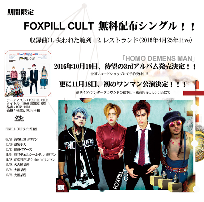 FOXPILL CULTが期間限定無料ダウンロード曲を公開。新MV披露記念として店頭にてレアトラック付きの限定サンプラーディスクの配布も決定