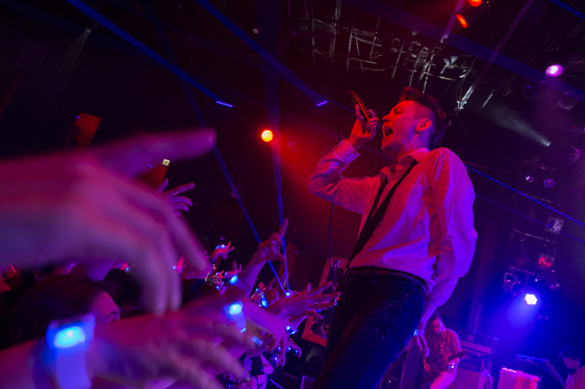 オープニングからThe Cheshire Catのイメージカラーであるピンクと紫の照明がフロアを照らす中、バンドは激しいサウンドを繰り出していく。曲がサビに突入するとLEDリストバンドはピンクの光を放ち、さらに客席に向けてレーザーも飛び交うなど、序盤から派手な演出でライブを盛り上げていった。続くアップテンポの「Someday」では、観客がリズムに合わせてジャンプ。LEDリストバンドも曲のパートごとに、さまざまな色を放ち続けた。