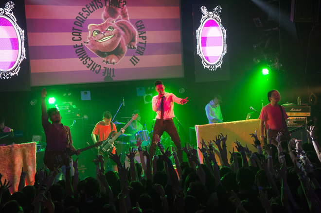 「まだ見つからないみたい。しょうがない、チェシャ猫の新曲、もうやっちゃおう」というKENの言葉に続いて、新曲「Beside Me Pink And Purple」を本邦初披露。スクリーンやステージ上&会場両サイドのLEDパネルには、青白い月の光が刺す森の様子が映し出され、ダークかつメロディアスなミディアムチューンを華麗に演出。そんな中、LEDパネルには時折、これまで不在だったThe Cheshire Catが姿を現し、この曲を盛り上げる。そしてスクリーンの青白い光は徐々にピンク&紫へと変わっていき、The Cheshire Catの世界に侵食されていく。この不思議な雰囲気を持つ新曲は、早くもオーディエンスから好意的に受け入れられた。