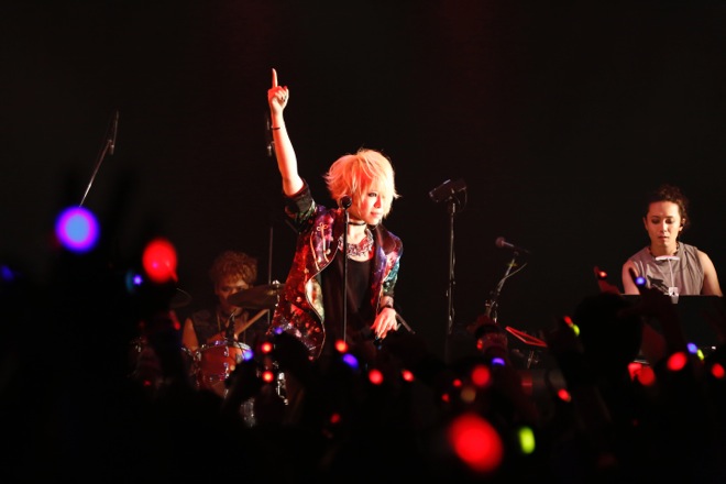 煽った後は「Human Dolls」から始まるスペシャルメドレー。人形のような仕草で客席に手を差し出して歌い、大歓声の中で「Blissful Jail」を熱唱するなど、めくるめくVALSHEの世界が立て続けに披露されていく。メドレーで“もっと聴きたい”という余韻を残しつつ、ステージが赤に染まった「赤い棘」では痛みと憂いを帯びた歌声でひきこんでいき、その落とした影を振り払うような疾走感あふれる「marvelous road」ではバンドのメンバーとアイコンタクトで呼吸を合わせ、テンションを上げていく。この曲で暴れるスイッチがオンになったかのように「Chewing girl」「WISHLIST」ではステージ狭しと動きまわり、場内を挑発。マイクを手にしたVALSHEは性別を超越した存在となる。女子からも憧れられる存在であり続けていることに納得させられる光景が目の前に広がっていった。