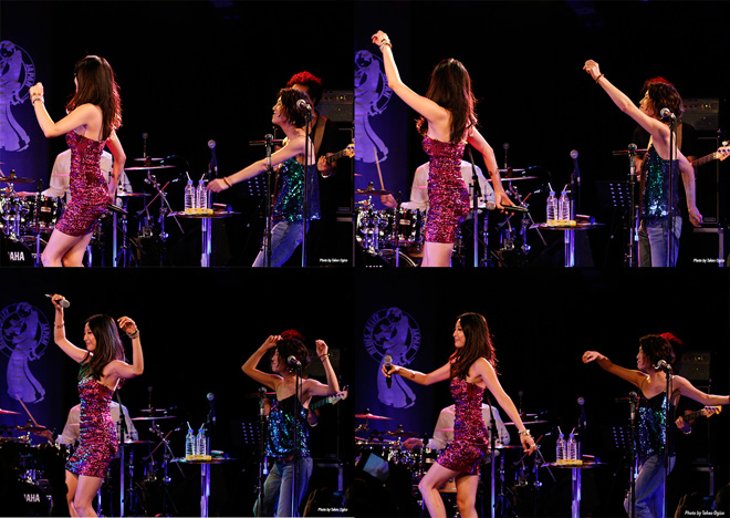 2ndステージは、スパニッシュ風味の「Falling Rain」で始まるが、アッパーな曲中心。ピンクのスパンコールから黄緑色のセクシーなドレスに着替えたルネージャは、ステージ上を右に左にと動きつつ、これまたセクシーなポーズを決めていく。スウィートな表現力と繊細ながらも強さを併せ持ったルネージャのヴォーカルは、その最強のビジュアルと共に観客の目と耳を惹きつけて離さない。英語詞曲が多くサウンドやメロディも洋楽風なのに、耳にとてもよく馴染むのが不思議だ。おそらく、英語はネイティヴなのに言葉のタイム感が日本人っぽいのだ。日本で洋楽風の音楽をやるにあたっては、理想的な資質だと言える。