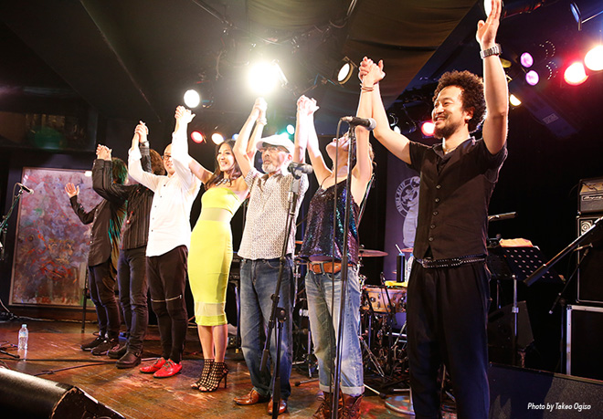 そんなムードが一変したのは、1stステージ最後の2曲だった。アルバムでは日本随一のファルセットシンガーであるDaisukeとのデュエットした「Sugar & Spice」は、Daisukeのパートを新井現詞が歌う。マイナー9thのジャジーなコード感が支配する中をベースのリフが引っ張っていくこのファンキーチューンで、リズム隊はこの日最高のグルーヴを生み出した。ベースの大神田は大きく身体を揺らし、この曲以降ドラムスの高田は笑顔が増えていく。2人のコンビネーションがネクストレヴェルに達した瞬間だった。1stステージ最後の曲「Into My Soul」では、おそらくアドリブであろう大神田がJBの「Cold Sweat」のあまりにも有名なリフを挿入する。それに対し、高田はワンコーラス後に同曲のリズムパターンで呼応してみせる。あまりにも有名かつ強烈な印象を持った曲だけに、ドラムとベースが同時にそれをやってしまうと楽曲が乗っ取られ、元の曲に戻ったときに違和感が残るかもしれない。とっさにそう判断したのだろう。彼らのミュージシャンシップの高さを感じ取れた瞬間だった。