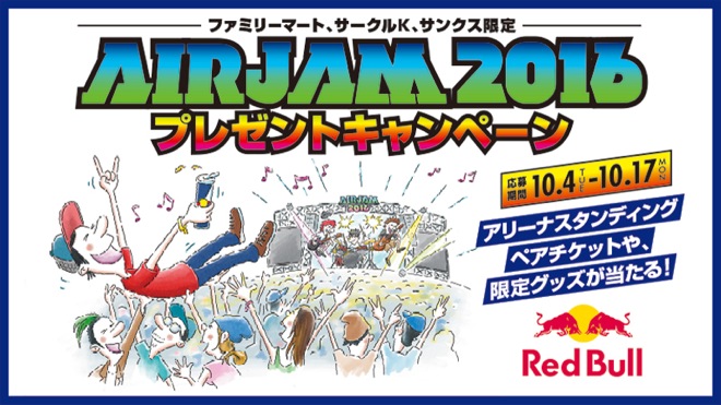 A賞は<AIR JAM 2016>アリーナ スタンディング ペアチケットが30組60名に、B賞は<AIR JAM>コラボデザインRed Bullクーラーが1名に、C賞はNEW ERA コラボスナップバックが500名に、D賞は<AIR JAM 2016>限定カラーロゴTシャツが300名に当たるというもの。応募期間は10月17日まで。