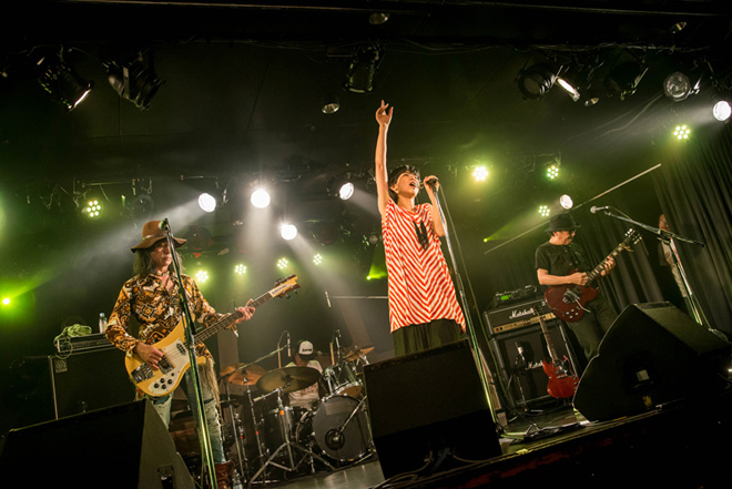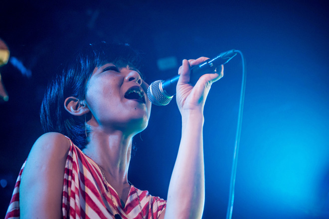 曲終わりで国岡が一言、「ようこそ~!」と告げると、オープニングとは打って変わってミディアム・ナンバー「Grab the Earth」を披露。清爽さと力強さが同居したボーカルがまっすぐにオーディエンスへ注がれていく。MCをはさみ、記念すべき主催イベントの第一回目を迎えられたことに感謝を述べた後、1stアルバム『φ』より「DRAGON YEAR」では清々しく突き抜けていくストレートなサウンドが心地良くフロアを満たしていった。