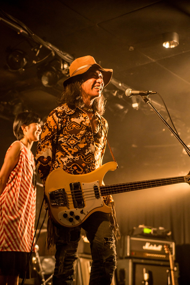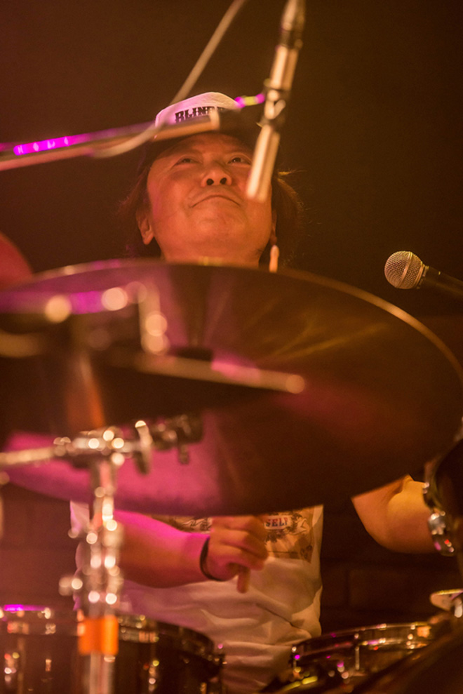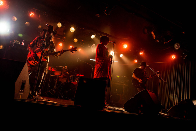 次なる「回天」は第一期BLIND HEADZでは、故・宮内和之(G/from ICE)がボーカルを務めたブルージーなナンバーで、その”男言葉”の歌詞や世界観が違和感なく実にサマになる国岡真由美の歌いっぷりや、タメの効いたリズムの中で繰り出される静と動のコントラストに耳を奪われる。KANAMEがボーカルを取る「ブラック・コルベット」ではタイトで骨太なグルーヴがオーディエンスを巻き込んでいく。続いてのMCでは、国岡真由美が前日に咲いた”月下美人”について嬉しそうに語ると、他メンバーがユーモラスなリアクションで応じるなど終始和やかな雰囲気で、クールな演奏とのギャップに場内の笑いを誘った。