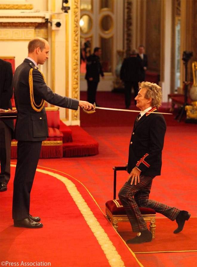 音楽と慈善活動への功績が認められ、6月、英女王の公式誕生日にナイト爵が授与されることが発表されていたロッド・スチュワートが、火曜日(10月11日)、バッキンガム宮殿で執り行なわれた儀式に出席。ウィリアム王子からナイト爵を授けられた。