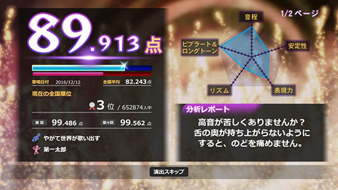 結果画面では「メロディーどおりに歌えているか」「こぶしやビブラートなど歌唱テクニックが上手に使えたか」などをわかりやすく表示。レーダーチャートや分析レポートにより、的確な歌唱アドバイスをしてくれる。