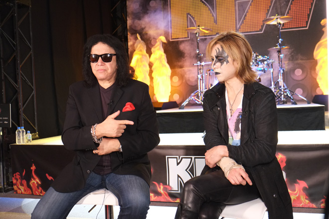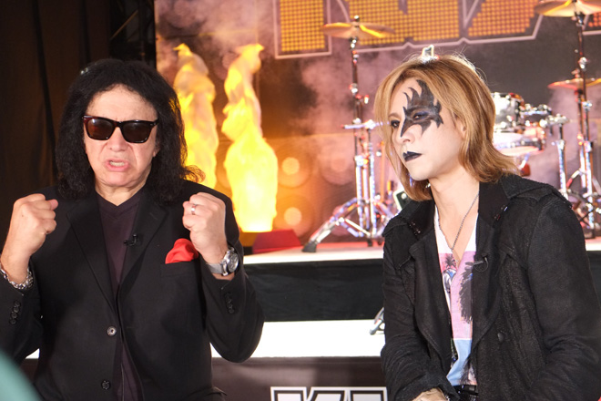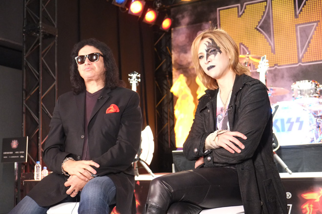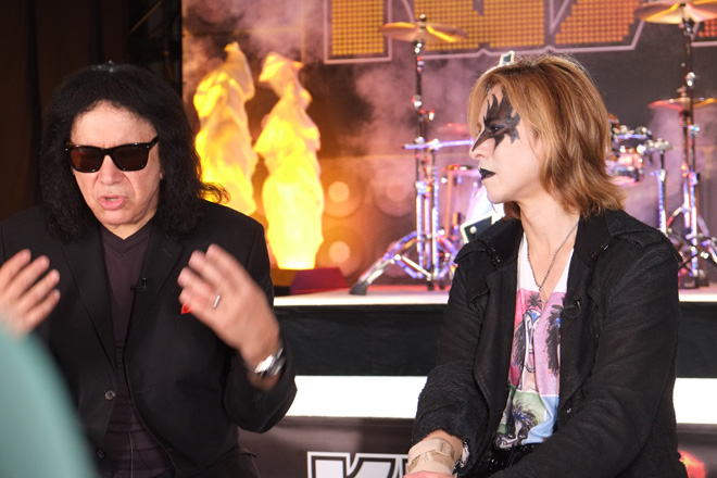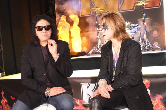 一通り、地獄の博覧会を堪能したYOSHIKIとジーン・シモンズは、会場内に設置された「KISS初来日時の武道館」の様子を模したステージの前で、トークを繰り広げた。YOSHIKIは弟と一緒に母親に連れられてKISSのコンサートに行ったのが、人生初めてのロックのコンサートだったことを語り、ロックという新しい扉を開いたのがKISSだったことを明言、「KISSがいなければ、今自分はここにいない。X JAPANもいない」と語った。TOSHIもKISSファンであり、それが仲良くなったひとつの大きな要因だったという。KISSの話ばかりしていたことから、バンドを演ろうかとTOSHIとバンドを組むことになり、「ラブ・ガン」「デトロイト・ロック・シティ」のカバーを行っていたのが、X JAPANの原型となるわけだ。