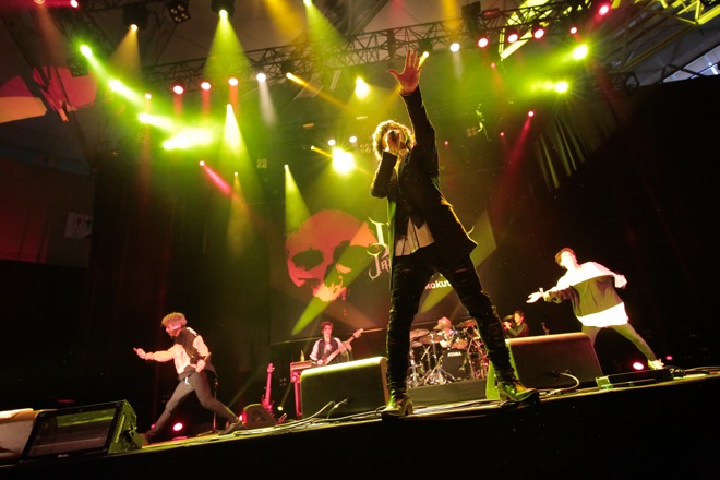 壮大でドラマティックなロックサウンドが持ち味の摩天楼オペラのステージには男性ファンも多く集まり、ライヴは彩雨〜ayame〜がショルダーキーボードをかまえての痛快なナンバー「BURNING SOUL」で幕を開けた。突き抜けるハイトーンヴォーカルを響かせる苑~sono~は「楽しんでるか!? 凄まじいよ。こんなに楽しかったら午前中から頭振るよね」と笑わせ、「今日のためにカバーしたんじゃないかと思う曲です」と以前に音源化したX JAPANの「紅」を披露。テクニカルな演奏と開放感あふれるアクトで摩天楼オペラ初心者も魅了した。