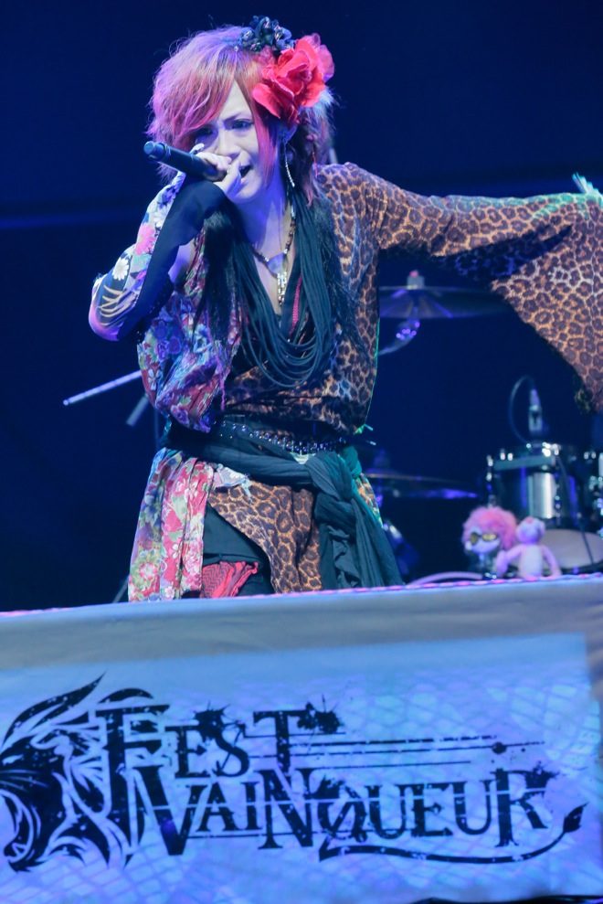 HAL(Vo)がハイトーンで「行くぞ! 幕張!」と叫び、着物風の艶やかな衣装で登場、ハイテンションなパフォーマンスで場内を盛り上げたのは大阪発のFEST VAINQUEURだ。ヘドバン&振りでファンが一体となるライブが彼らの特徴だが、そのみなぎるパワーに人がどんどん集まってくる。「生まれて初めてこの幕張のステージに立ちました。生まれて初めて聞く声を届けてください。V系魂にのっとって全力で行こうと思うので、みなさんついてきてくれますか!?」と呼びかけ、リリース間近の新曲「ヒガンバナ〜花魁道中〜」では扇子を振り、後半に行くにつれてヘドバンの嵐。大阪のバンドだけあって、グリコのポーズも盛りこまれ、「飴ちゃん、めっちゃ持ってきたから」と袋から飴を投げて、オーディエンスを楽しませた。持ち時間オーバーにつき、幕が強制的に閉ざされるというエンディングにも場内爆笑。