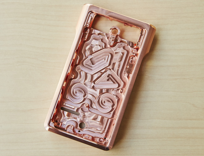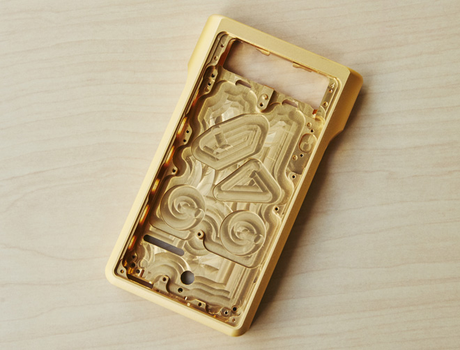 ▲約1.8kgの無酸素銅ブロックを削り出してシャーシを整形、金メッキ処理を施して、NW-WM1Zの筐体が完成する。