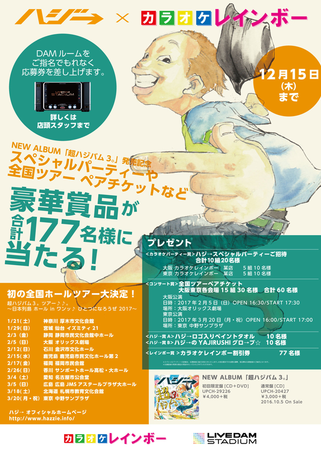 ハジ→のニューアルバム『超ハジバム3。』の発売を記念して、スペシャルパーティーご招待や全国ツアーペアチケットなどの豪華賞品が当たるキャンペーンが、カラオケレインボーでスタートした。