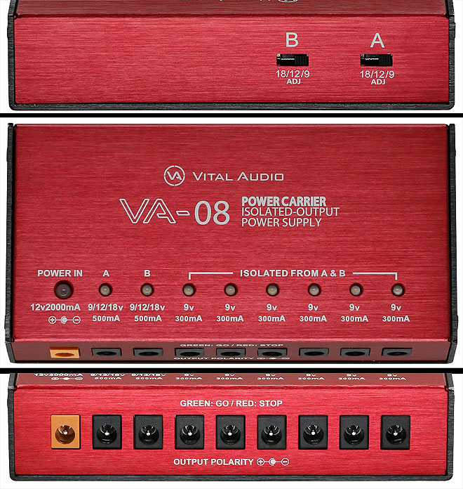 「VA-08」は、アイソレートタイプのパワーサプライで、付属のACアダプター(DC 12V/2000mA)を接続した本体内部で複数のDC出力をつくり出す。9V/300mA DCを6系統供給。さらに9V/12V/18V可変の500mAを2系統装備。本機1台でさまざまなタイプのエフェクトペダルをドライブできる。可変ポートと9Vポートはアイソレートされ、互いに干渉しあわないだけではなく、各ポートに保護回路が内蔵され、どこかのポートに不具合が生じても、すべてがダウンしてしまう危険性がなくなるのもポイントだ。