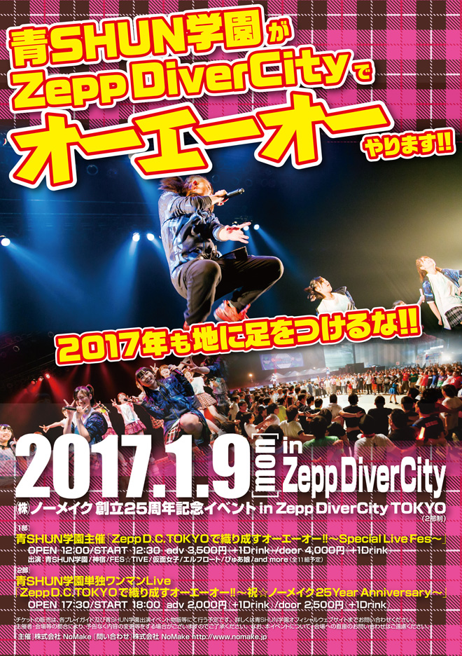 本日は来年2017年1月9日(月・祝)に迫りました、青SHUN学園が2度目となるZepp Diver City TOKYOでの主催Live&ワンマンLiveを開催する中で、1部の主催Liveのイベント概要、第一弾発表をしたいと思います。