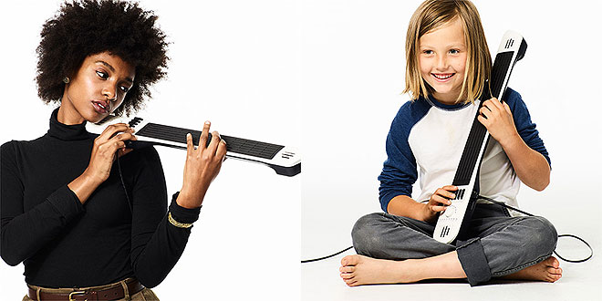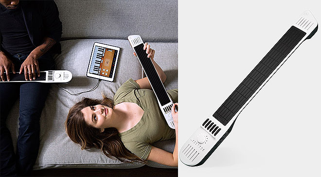 「Artiphon INSTRUMENT 1」は、インスピレーションに合わせて新しい音楽を追求できる楽器。充電可能なバッテリーで動作、iOSデバイスやPCに接続すればあらゆる音色を奏でることができる。ギターをかき鳴らすようにコードや音階を演奏、指をすべらせればバイオリンやスライドギターのように滑らかに音が変化、指を左右に小刻みに揺らせばビブラートも加えられる。また、6オクターブにわたる72の圧力センサー鍵盤が配置されたフィンガーボードを使ってピアノのように演奏することも可能。さらに12のパッドに分けられたフィンガーボードでビートを刻み、ループさせることまでできる。