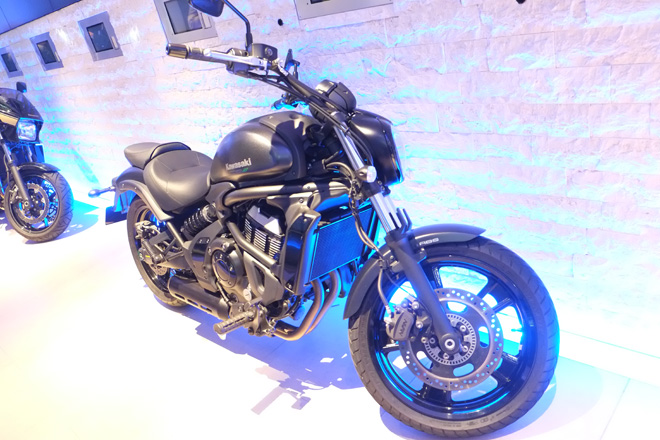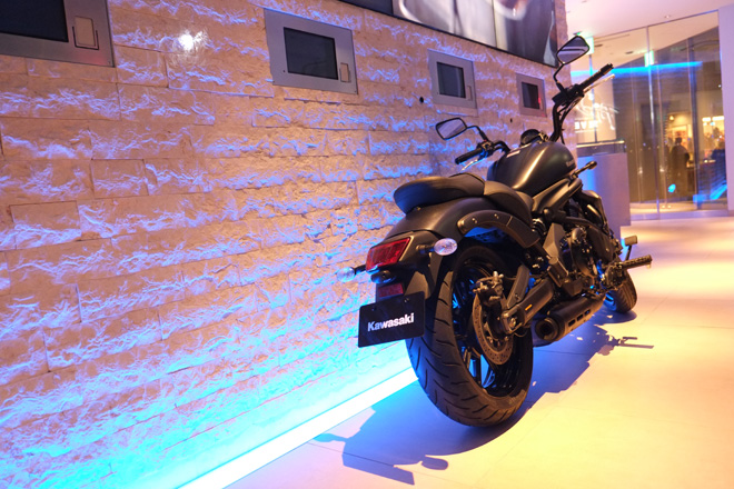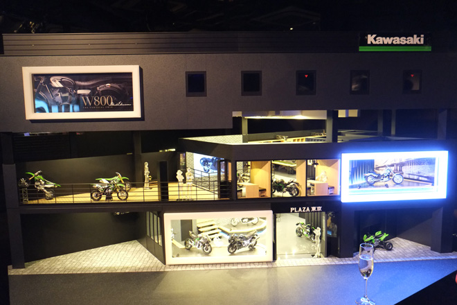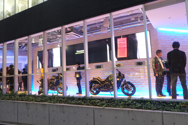 この日のレセプションパーティーでは、KAWASAKIのバイクが展示されているのみならず、ショップで販売展開されるコラボ商品の展示やPLAZA大阪鶴見の12分の1スケールのモデルなども展示され、多くのバイカーの興味を惹きつけていた。ちなみにこの日のI Don’t Like Mondays.もライダースファッションに身を包んでいたが、プライベートでもよくバイカースタイルは採り入れているんだとか。