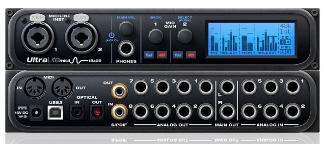 「UltraLite-mk4」は、2つのXLR/TRS入力、6つのライン入力と10のアナログ出力、8チャンネルのオプティカル入出力(2チャンネルのTOSLinkとしても使用可)、RCA S/P DIF、MIDI入出力、ヘッドホン出力を装備。最大192kHzまでのサンプルレートコンバージョンの性能を保持。ドライバはローレイテンシーに最適化されているほか、クラスコンプライアントやUSB 3.0ポートでの使用、iOSにも対応する。アルミニウムの軽量で頑丈なボディもモバイルの強い味方だ。
